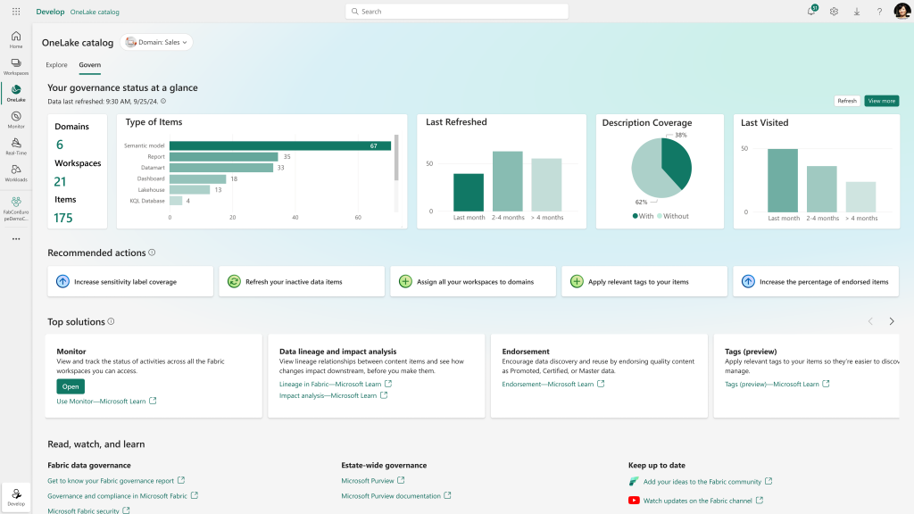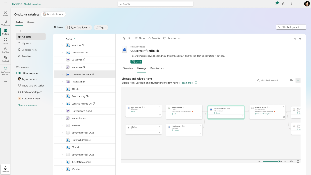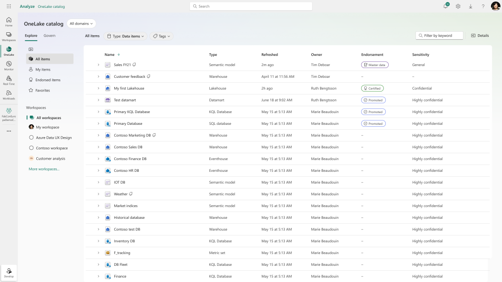 Le OneLake Catalog unifie l’accès à tous vos éléments Fabric. Que vous soyez un ingénieur data, un analyste ou un décideur, vous pouvez désormais naviguer entre :
